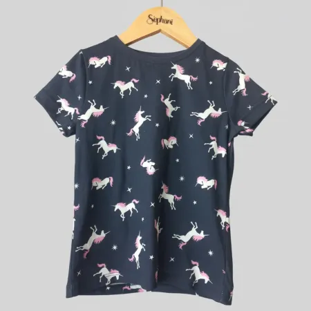 An adorable and comfortable Navy Blue T-shirt from F&F for toddler girls (Size 5-6 years). Crafted from 100% pure cotton for ultimate softness and breathability. Features a fun print and a flattering scoop neck, making it perfect for everyday play. Imported quality from Bangladesh.