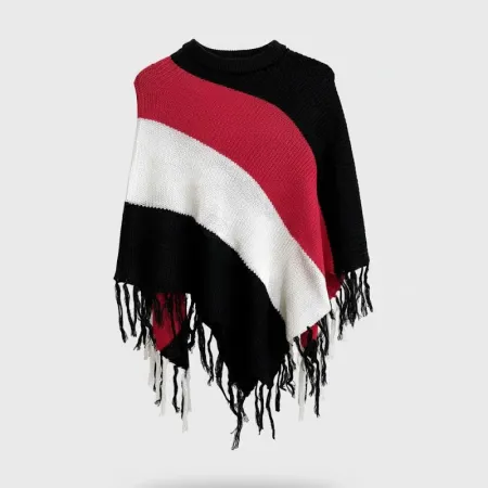 This ZARA Striped Poncho is an elegant, multi-stripe knit layering piece, perfect for women's winter wardrobes. It functions as a stylish alternative to a cardigan or sweater coat, offering a soft, cashmere-like feel and a contemporary design. The striking black, red, and white pattern, combined with the fringed asymmetric hem, provides a relaxed yet sophisticated silhouette that works as a fashionable blanket scarf or chic wrap.