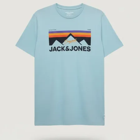 A cool and comfortable imported Jack & Jones Originals t-shirt in a refreshing light blue hue. It features a retro-inspired, colorful mountain and sunset graphic with the brand's logo. Made from soft cotton, this crewneck tee is ideal for casual outdoor and leisure wear. One piece is available in size Large.