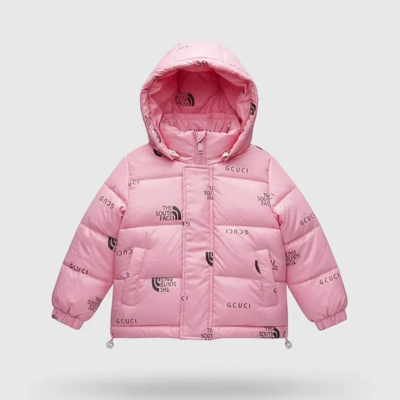 Product Type: Kids Puffer Jacket (Winter Wear) Color: Pink (with Yellow Lining) Brand (Handwritten): Gucci (Note: Jacket features multiple logo prints) Brand (Tag): CHUANG JIN BEAR Origin: Made in China Fabric: Polyester (100% Shell & Lining) Filling/Insulation: 90% White Duck Down, 10% Feather Pockets:
