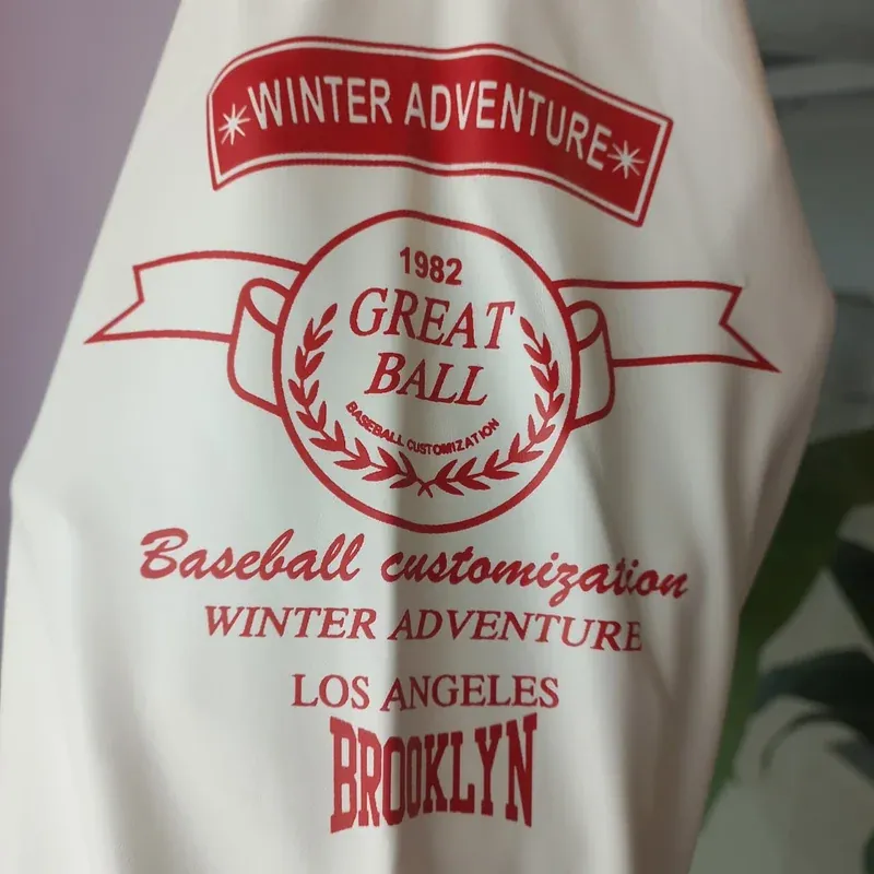 Product Specifications (Text Lines Only): Product Type: Varsity Bomber Jacket Primary Color: Red (Body), White (Sleeves) Front Graphic: Dragon, Brooklyn, Florida Sleeve Detail: Winter Adventure, Great Ball 1982, Los Angeles, Baseball Customization Material: 100% Polyester Closure: Snap-Button Front Sizing: Available in various sizes (Please specify your available size range)