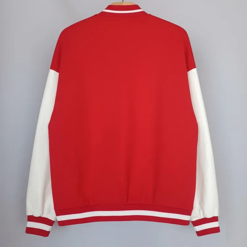 Classic Two-Tone Design: Features a striking Red body and contrasting White sleeves with striped red and white ribbed cuffs, hem, and collar.