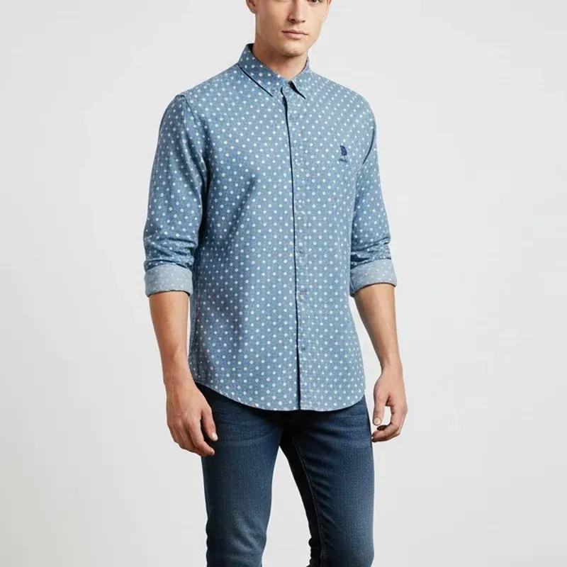 The U.S. Polo Assn. Men's Long Sleeve Button-Down Shirt is a stylish, casual top featuring a classic blue base with a white polka dot pattern. It's crafted from comfortable cotton and finished with the iconic U.S. Polo Assn. emblem.