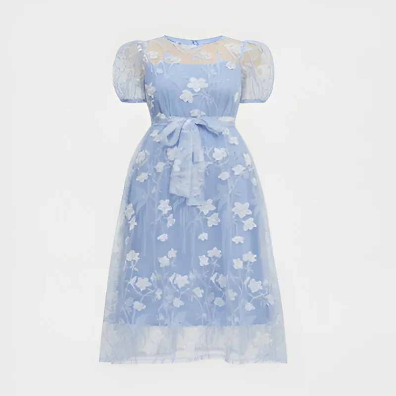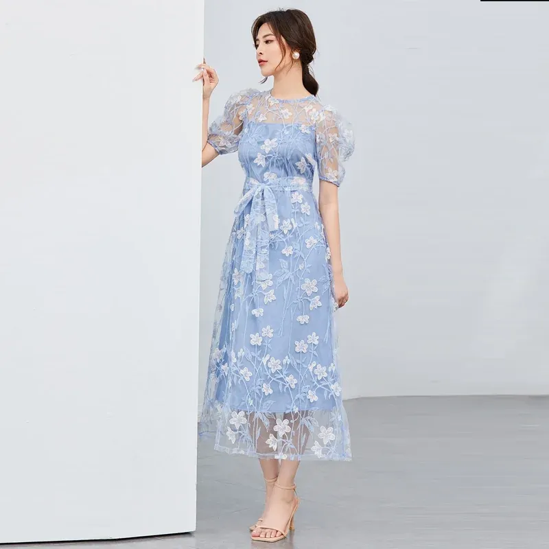 An elegant and romantic maxi dress from the SHEIN Modelyn collection. This dress is characterized by its delicate floral embroidery over a sheer mesh overlay, giving it a feminine, ethereal feel. Key features include fashionable puff sleeves and a matching mesh belt to cinch the waist. Perfect for special occasions, semi-formal events, or sophisticated daily wear.