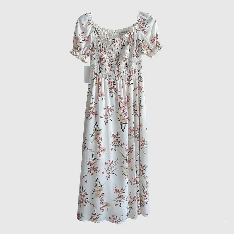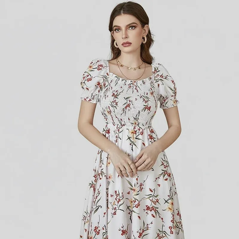 Fit & Silhouette: The dress features a highly popular Shirred (smocked) bodice that creates a comfortable, elastic stretch, cinching neatly at the High Waist before flowing out into an A-Line skirt with a graceful Flared Hem.