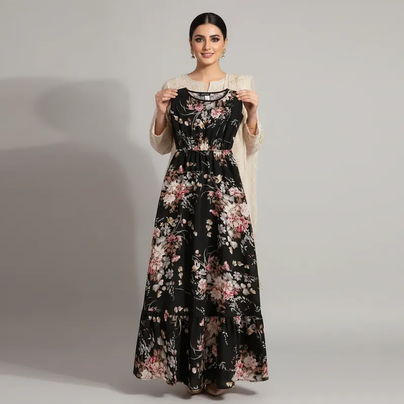 An elegant and versatile long dress featuring a timeless floral print and ruffle hem. Designed with a flattering A-line silhouette, this dress offers effortless charm for spring and fall occasions.