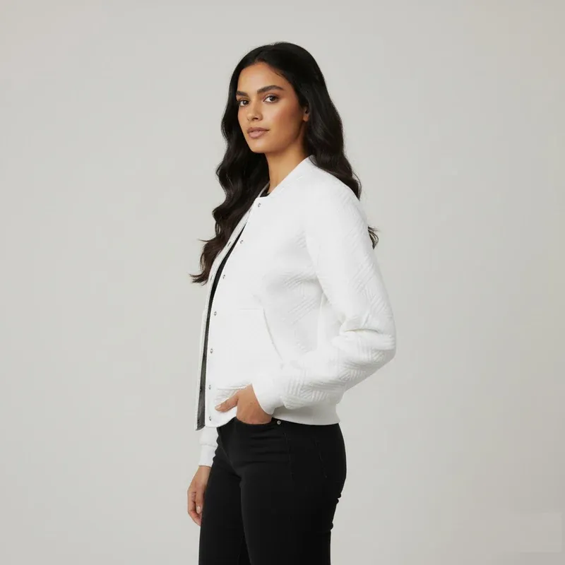 Step out in effortless, sporty style with our White Textured Bomber Jacket. This contemporary piece is perfect for transitional weather, offering a comfortable fit with a fresh aesthetic. The jacket features a unique, subtle diagonal textured pattern across the fabric, adding dimension and interest to the clean white canvas. Practical details include large front patch pockets and stylish silver snap buttons for easy closure. The ribbed cuffs and hem secure the fit, while the relaxed shape makes it ideal for layering over your favorite casual tops. Pair it with joggers or denim for an immediately chic, off-duty look.