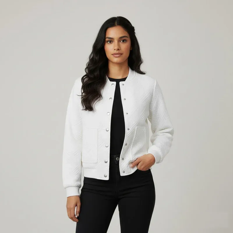 The White Textured Bomber Jacket is a stylish women’s jacket featuring a geometric, diagonal quilted texture. It has a regular or cropped length, long sleeves, and a ribbed stand-up collar. Designed with a snap button closure and medium thickness, it offers a relaxed fit perfect for a casual or sporty chic look during spring and autumn seasons. Origin: Mainland China.