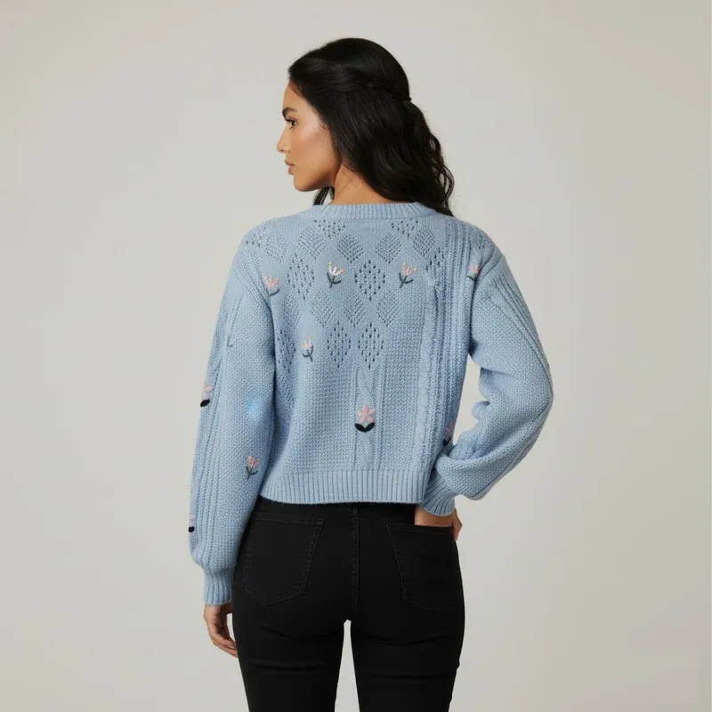 Charming Powder Blue Cable Knit Sweater with Pink Floral Embroidery